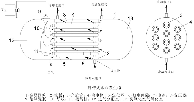 放電室內冷卻水直接對介質管(外電極)進行冷卻,將放電過程中產(chǎn)生的熱量及時散出,進入的干冷空氣對內電極進行冷卻,使介質管溫度保持穩(wěn)定.不易擊穿,使產(chǎn)量穩(wěn)定。